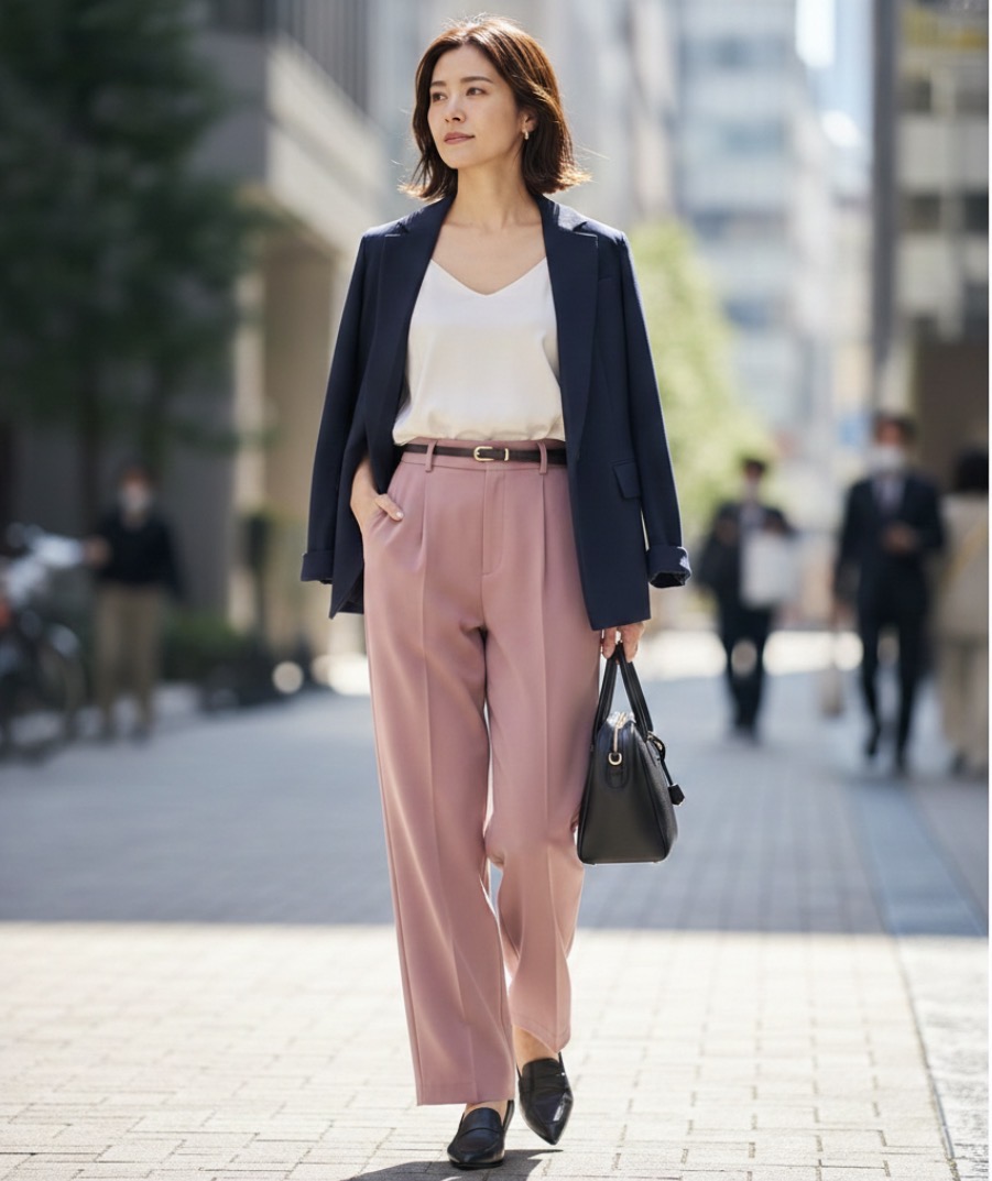 そこに黒のジャケットを羽織るだけで、ピンクの甘さが引き締まり、一気に「大人の外出着」に昇華されます。