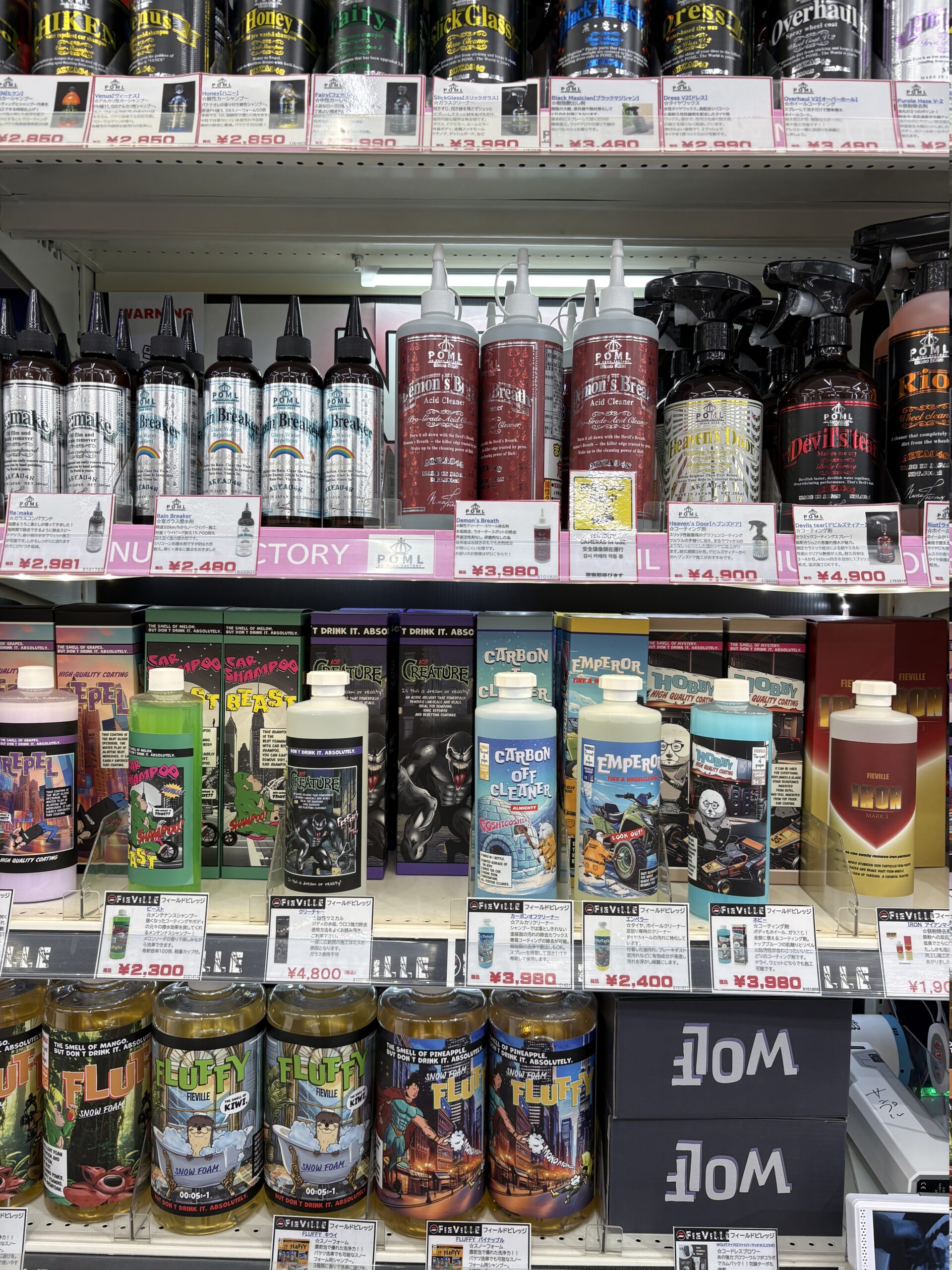 2,000円から10,000円まで、幅広い価格帯のカーシャンプーが並んでいました。